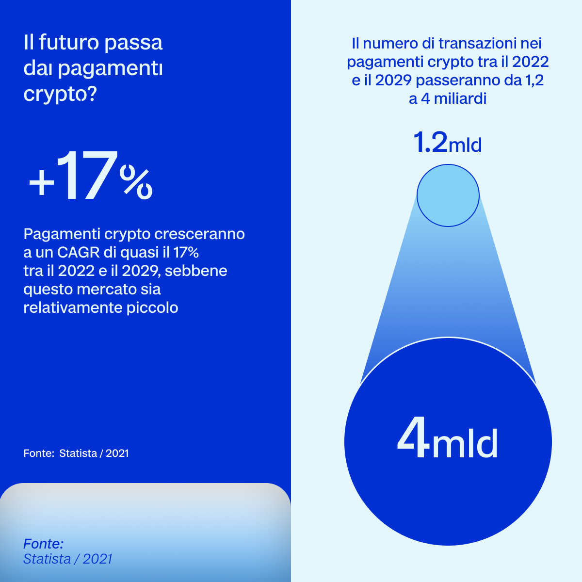 Nel frattempo si stanno sviluppando sempre di più i pagamenti tramite criptovalute, seppure non siano ancora paragonabili ai pagamenti digitali classici: sempre secondo la piattaforma Statista si prevede che i pagamenti crypto cresceranno a un CAGR di quasi il 17% tra il 2022 e il 2029, sebbene il mercato sia relativamente piccolo, passando dai 1,2 miliardi di transazioni attuali ai quattro della fine del decennio. E in questo sistema si integra l'intelligenza artificiale: l'AI è uno strumento incredibilmente potente per gestire le transazioni delle criptovalute con l'applicazione del machine learning che consente un rilevamento più efficace delle frodi e maggiori tassi di autorizzazione.