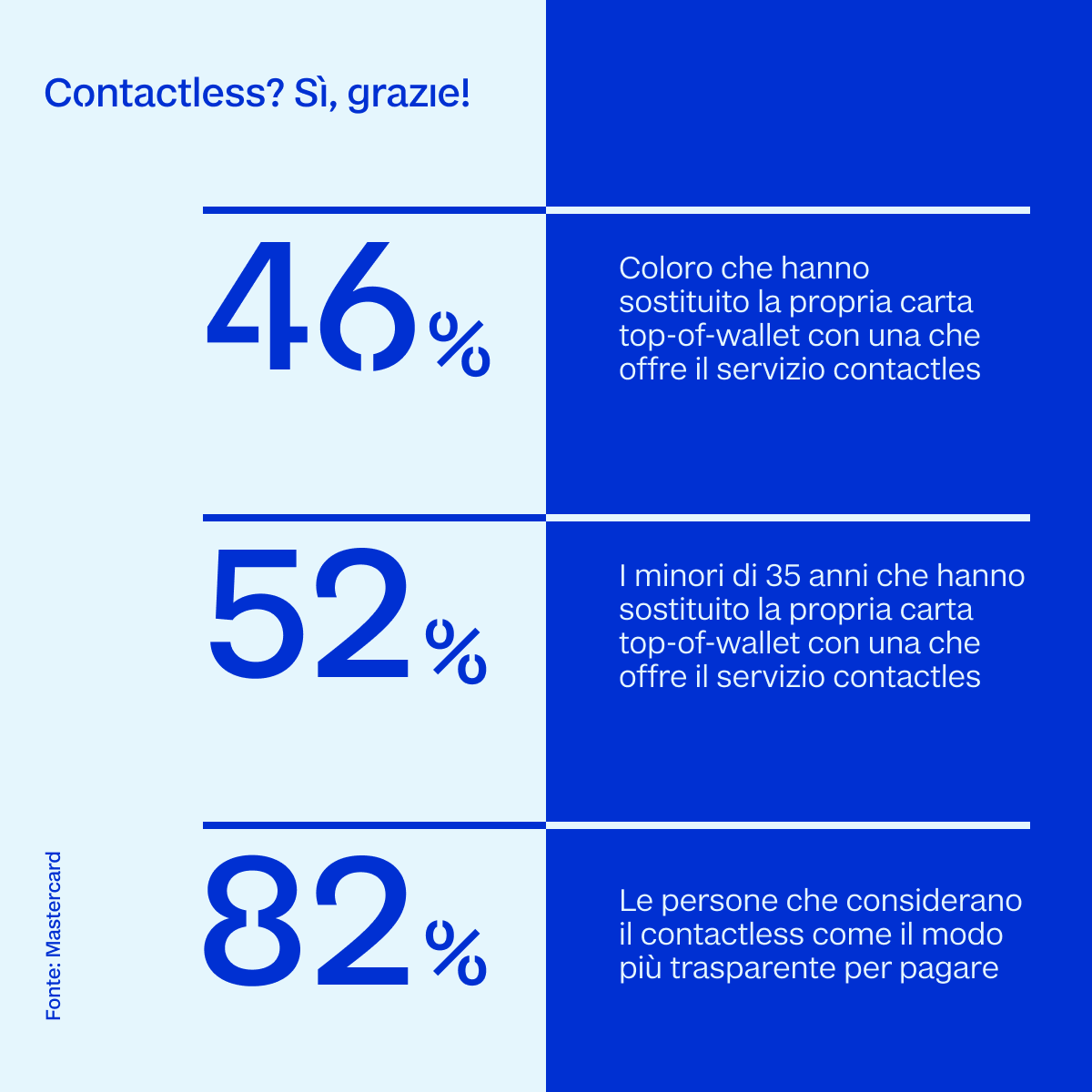 Insieme allo sviluppo di portafogli digitali c'è anche un'altra rivoluzione che si è sviluppata di pari passo, quella del contactless: secondo uno studio di Mastercard ripreso da Forbes le percezioni di sicurezza e convenienza hanno stimolato la preferenza per le carte contactless. A livello globale quasi la metà degli intervistati (46%) ha sostituito la propria carta top-of-wallet con una che offre contactless: questa percentuale sale al 52% tra i minori di 35 anni. La maggior parte degli intervistati (82%) considera il contactless come il modo più pulito per pagare e i pagamenti di questo tipo sono fino a dieci volte più veloci rispetto ad altri metodi di pagamento di persona, consentendo ai clienti di entrare e uscire dai negozi più velocemente. I dispositivi si sono moltiplicati e non riguardano solo le carte: smartphone con funzionalità NFC ma anche dispositivi indossabili.