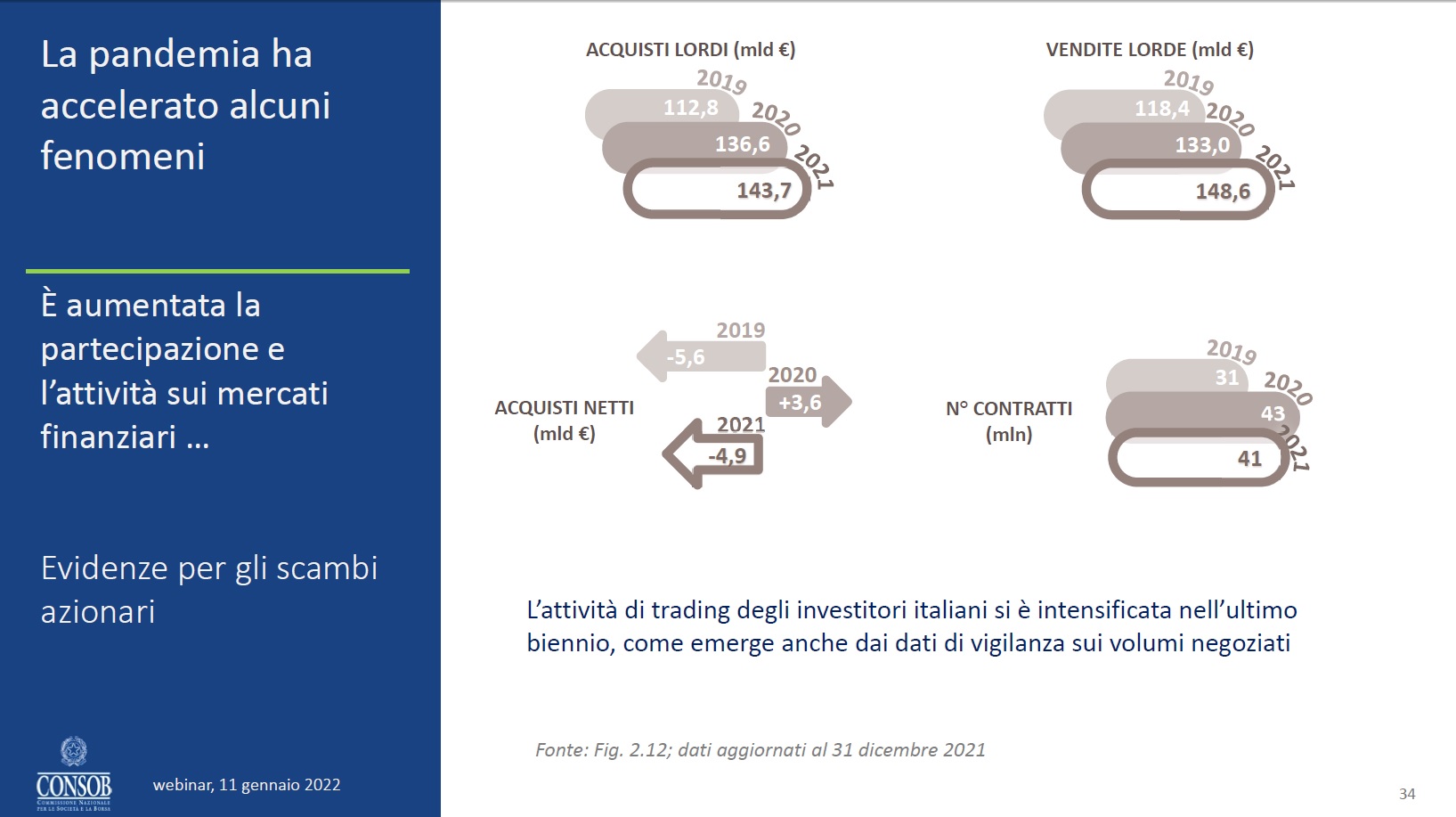 Interesse che è anche aumentato in questo ultimo periodo caratterizzato dalla pandemia, come evidenziato dal VII Rapporto 2021 sulle scelte di investimento delle famiglie italiane realizzato dalla Consob. Tra coloro che utilizzano la rete per scelte economico-finanziarie, infatti, circa il 28% riferisce di usare servizi finanziari online più di quanto facesse prima della pandemia ed è quasi sempre disposto a continuare a farlo. La crescente curiosità per il trading online emerge anche dai volumi, aumentati considerevolmente negli ultimi mesi, e dal numero di ricerche sul tema effettuate in rete che hanno registrato un forte incremento.